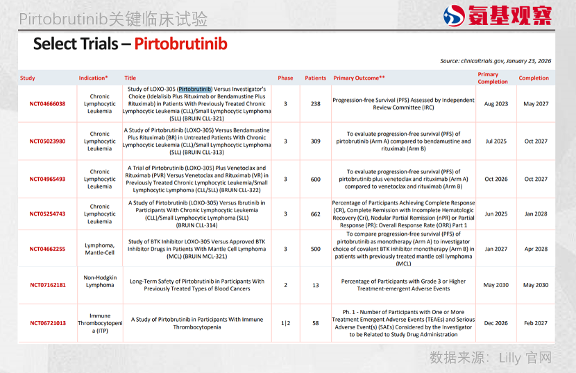 2026年1月16日,麓鹏制药注册了洛布替尼头对头礼来Pirtobrutinib治疗R/R CLL/SLL的全球3期临床试验,竞争意图明显。