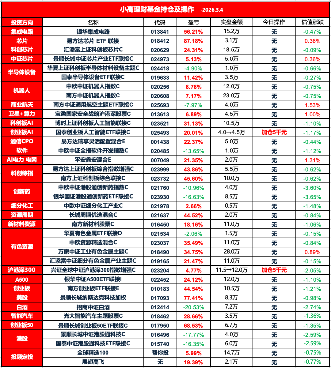 小高今天低吸加仓两个方向,分别是$国泰创业板人工智能ETF联接C$和$兴全中证沪港深300指数增强C$!小高进攻端加了人工智能,防守端加了沪港深300,今天属于攻守兼备!市场从来不是按直线走的,跌出来的空间,往往也是接下来孕育机会的土壤。小高自己会继续稳扎稳打,稳健复利!无论多忙小高都会坚持免费分享自己的基金操作策略,希望大家都能点赞、点关注支持下小高,你们的支持真的就是小高坚持每天免费分享的最大动力!