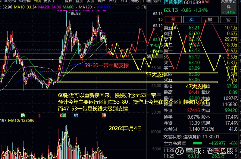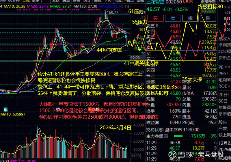 下图是$三花智控(SZ002050)$ 最新思路,大方向和大支撑基本上没变,没有底仓的现在就可以开始进一些做记号了,难得再次回到48下方。今年预计41-60还是主要震荡区间,41-44一带可作为波段下轨,重点进场区,55往上就要谨慎了,分批落袋,保留底仓反复做波段上去即可