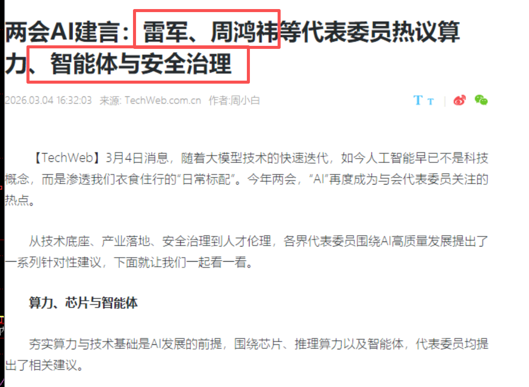 360昨天冲高回落出上影线,没有弱转强也没有企稳迹象,持续下跌必须要爆量有新的主力进场才能扭转颓势,两会议题来看AI的热度开始提升,雷军和周鸿祎都有发言,主要还是要看新的Z策利好,360AI 只是一个维度,主要还是要看网络安全方向出利好,目前只有等着了。