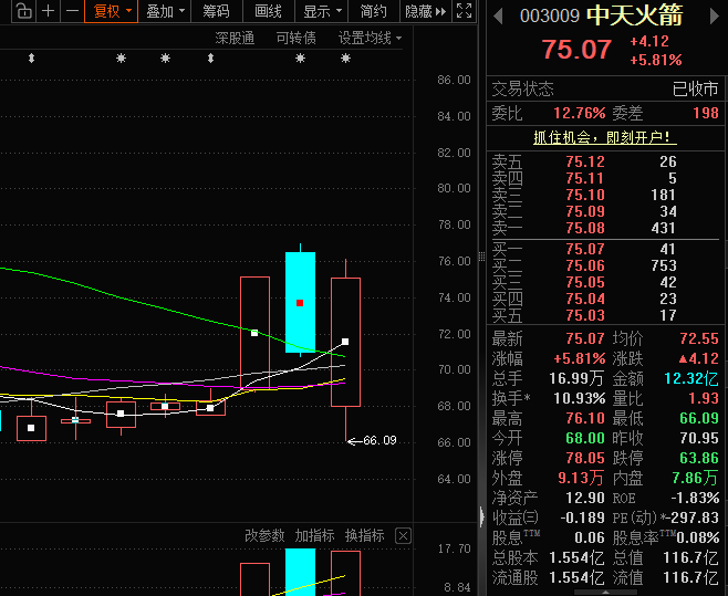 场外的朋友:想进场的只做低吸不追高。中天火箭今天转债最后转股日,波动会很大。只等回踩72区间位置企稳再买,不到坚决不进场。