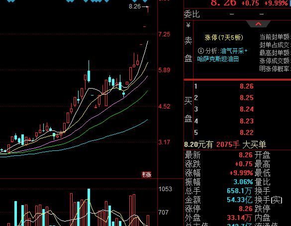 去年12月启动主升浪,一直在20天均线上方运行。本周连续三天涨停,昨天T字板,封单67万手,封单资金5.59亿,市场第二,资金认可度极高。7天5板,股价从4块多干到8块多,妥妥的板块高度龙头。