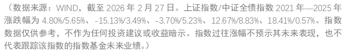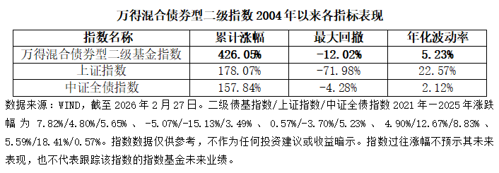 在当前低利率、高波动的市场环境下,做好资产配置的重要性已不言而喻,且近年来各类资产也呈现出丰富的结构性机会,例如2025年权益、黄金两类资产的明显上涨,投资不应再局限于单一资产,多元布局有助于把握不同资产的行情,而“固收+”产品就有望助力投资者较好把握多元资产的长期机遇。 从券商观点看,机构对2026年的股、债后市行情普遍偏乐观。 股票方面,多数券商认为,国内外增量资金入市、企业盈利修复、政策端加码等多重因素或支撑A股市场后续表现,2026年A股有望继续走强,并看好科技、顺周期、消费、出海等多个领域的投资机会。 债券方面,2026年债市整体或将呈现出“宽幅震荡、中枢温和抬升”的特征,利率债与信用债可能延续结构分化格局。 股、债资产新年投资行情可期,为“固收+”产品的管理运作提供了有利环境。而从中长期的投资回报看,虽然市场行情多变,但“固收+”产品凭借科学多元的资产配置,力争为投资者提供收益弹性更足、波动回撤更小的高性价比配置选择。 以二级债基指数为例,自2004年以来累计上涨426.05%,相比股票资产(以上证指数代表)、债券资产(以中证全债指数代表)具有显著超额收益,跑赢了单一资产表现。同时,该指数的最大回撤、年化波动率为-12.02%、5.23%,都明显小于股票资产。
