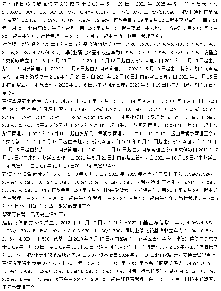 老产品业绩可圈可点的同时,建信基金近期再度推出“固收+”新产品——建信丰享债券基金(A类026506、C类026507),以期进一步丰富投资者的“固收+”配置选择。 具体来看,新产品对债券的投资比例不低于基金资产的80%,同时对股票、可转换债券的投资比例为基金资产的5%-20%,将积极捕捉A股、港股、可转债的投资机会,力争为投资组合增加收益弹性。 此次的新产品将由建信基金资深基金经理黎颖芳管理,她拥有25年证券行业从业经验、16年基金经理任职经验,投资中以资产配置见长,注重从宏观经济、流动性、估值三维度出发,自上而下大类资产配置。 作为基金管理人,建信基金在第22届基金业金牛奖评选中,荣获“金牛基金管理公司”奖。(评奖机构:《中国证券报》,评奖日期:2025年12月30日。)