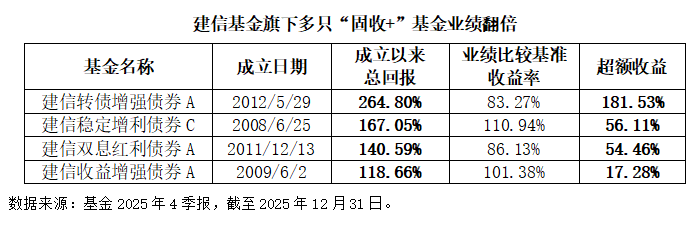 随着投资优势持续显现,“固收+”产品也受到了投资者的青睐,产品规模持续扩张。截至2025年底,全市场2292只“固收+”基金规模达2.99万亿元,创下历史新高。 (数据来源:中金公司,以一级债基、二级债基、可转债、偏债混、低仓位灵活配置基金、偏债混合型FOF统计,截至2025年12月31日。) 作为在“固收+”领域深耕多年的基金公司之一,建信基金充分发挥多资产管理能力,采用+股票、+量化、+可转债、+商品多元化的“+”策略,为投资者构建起覆盖低波、中波、高波等多层次风险收益特征的“固收+”产品矩阵。 目前,已涌现出多只成立10年多、历史总回报超100%的绩优“固收+”产品,在复杂的市场环境中致力为投资者把握住多资产机遇,且相比业绩比较基准均有明显的超额收益。
