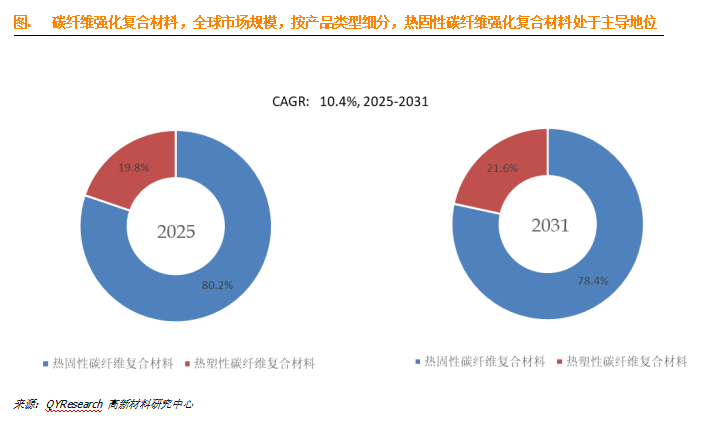 就产品类型而言,目前热固性碳纤维强化复合材料是最主要的细分产品,占据大约80.2%的份额。。