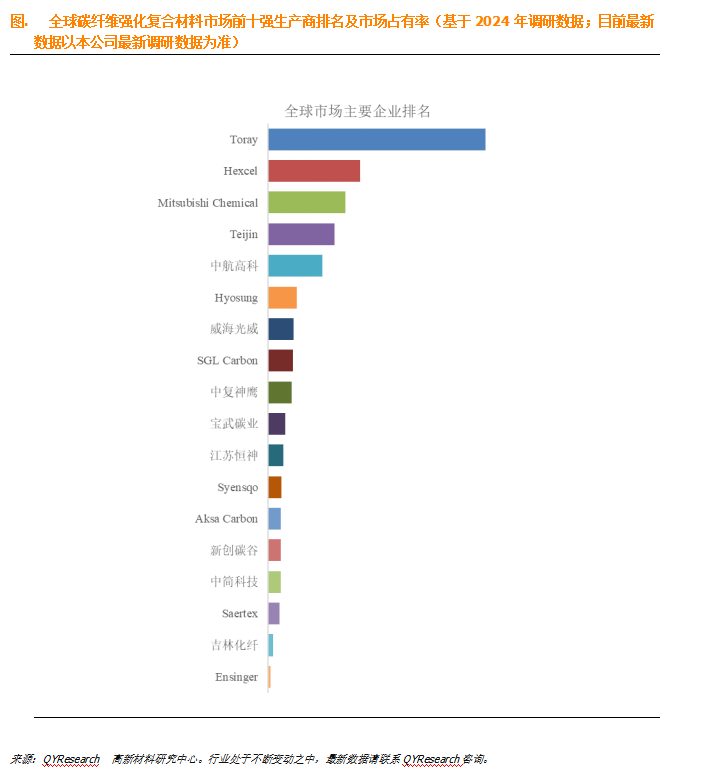 根据QYResearch头部企业研究中心调研,全球范围内碳纤维强化复合材料生产商主要包括Toray、Hexcel、Mitsubishi Chemical、Teijin、中航高科、Hyosung、威海光威、SGL Carbon、中复神鹰、宝武碳业等。2024年,全球前十强厂商占有大约81.0%的市场份额。