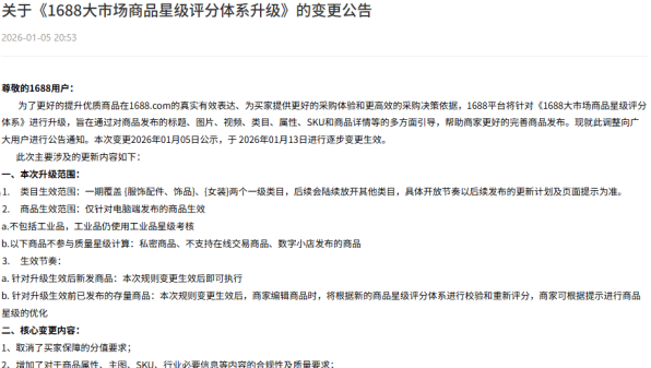 据出海网报道,本次规则变更的主体为1688平台运营方,其核心目标直指优化严选商家的准入与管理机制。