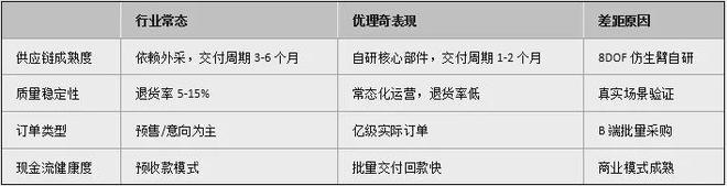行业常态是,大量初创公司高度依赖外采核心部件,交付周期动辄 3—6 个月,产品退货率普遍在 5%—15%。这揭示了一个被热闹掩盖的事实:人形机器人的竞争,表面看是算法与姿态的比拼,底层却是供应链与工程能力的较量。