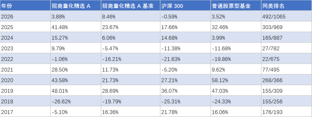 招商量化精选A的业绩分布也无可挑剔:2022年和2023年的熊市中扛得住回撤,2024年至今的牛市又能跟得上节奏。