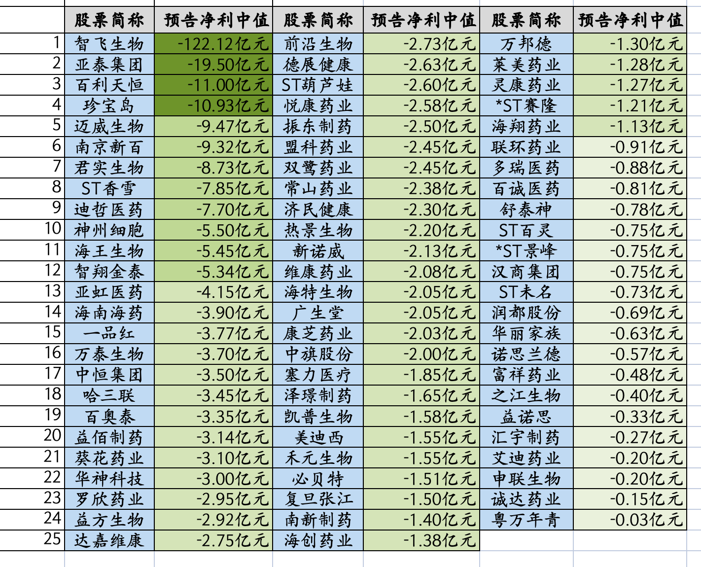 其中智飞生物亏损122亿,亚泰集团,百利天恒,还有珍宝岛亏损金额都超过10亿,这些亏损的医药大多受5个利空影响的,具体如下: