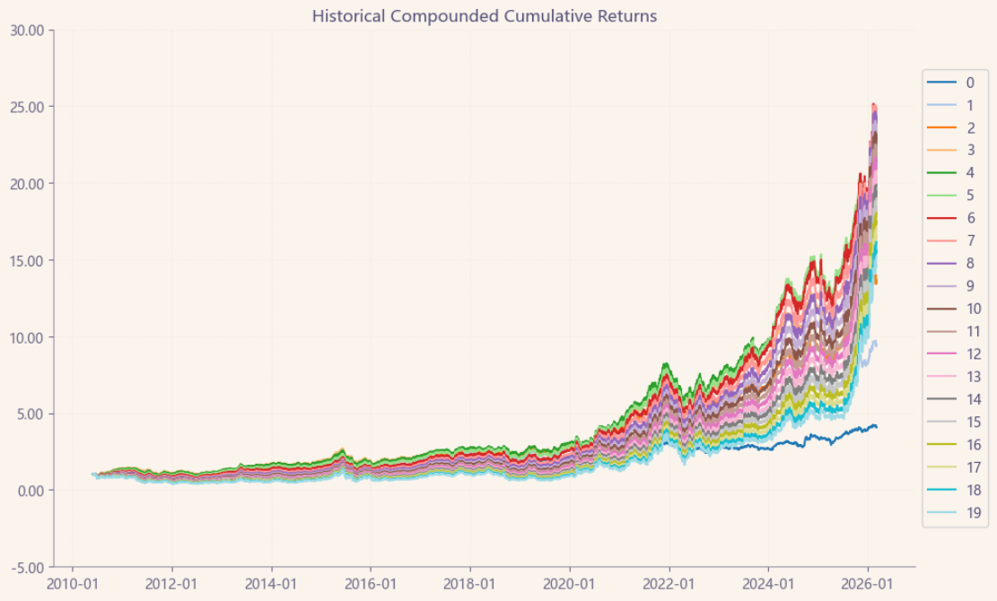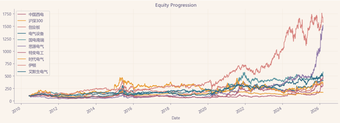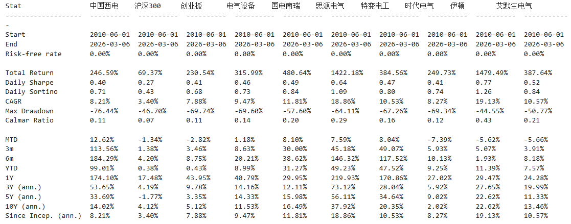 区间累计回报近25倍,最大回撤45.03%,投资组合的整体表现要好于中国西电个股。整个电气设备行业盈利能力不俗,波动中低,夏普比率1.01还算优秀。(Cumulative Returns;Maximum Drawdown)