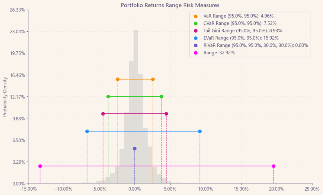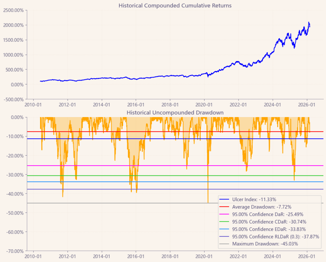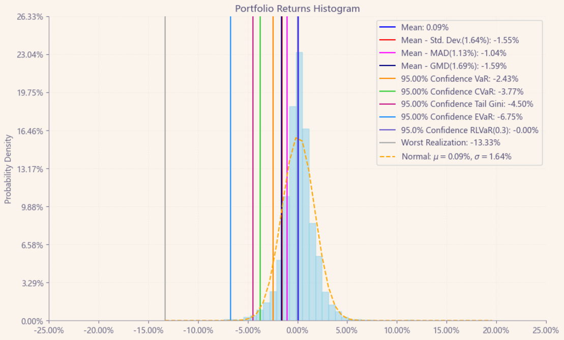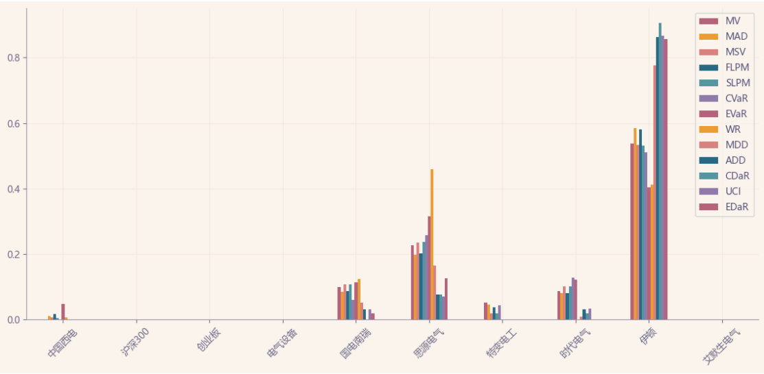 最后看下整个投资组合的情况,日度均值回报在0.09%,比上次测的航天航空行业低40%,相应地7.53%的CVaR波动也小一些。(Mean;CVaR)