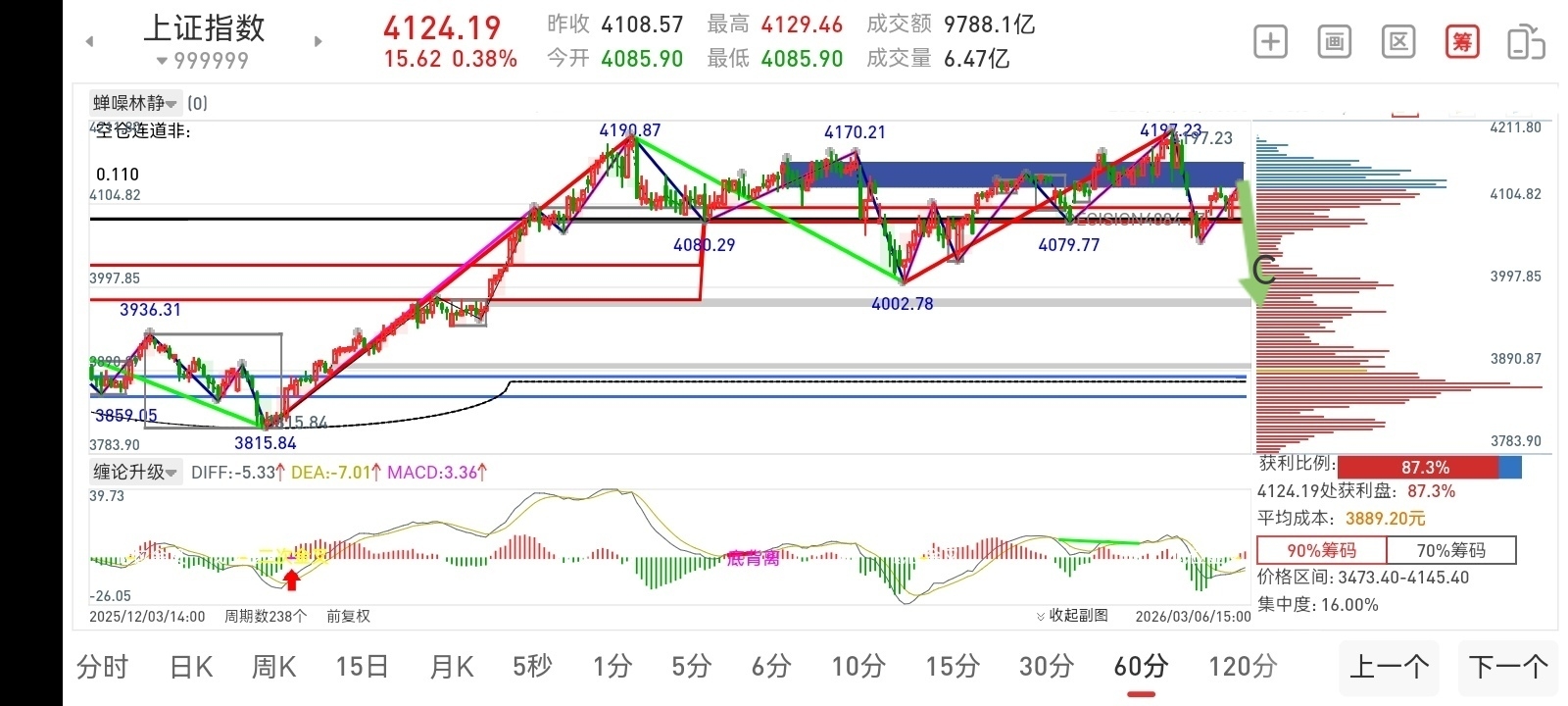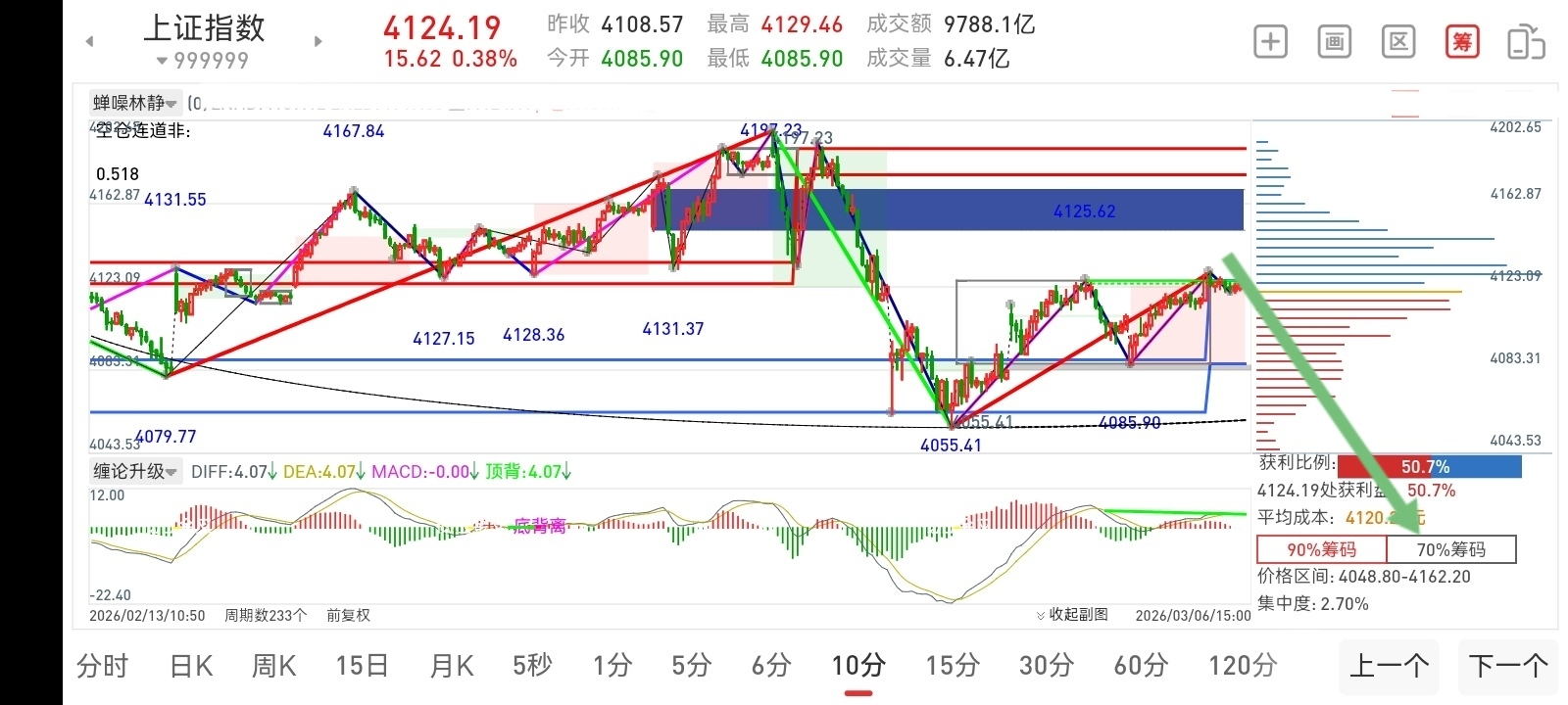 先来看10分钟走势解决短线问题,这里构建了一个MACD粘合中枢,大概在4085—4119点之间。“两会向上跳空缺口”暂时有效,那上证指数就会在这里反复横跳,MACD持续反复粘合。如果只看10分钟走势,“两会跳空缺口”会被击破是肯定的。