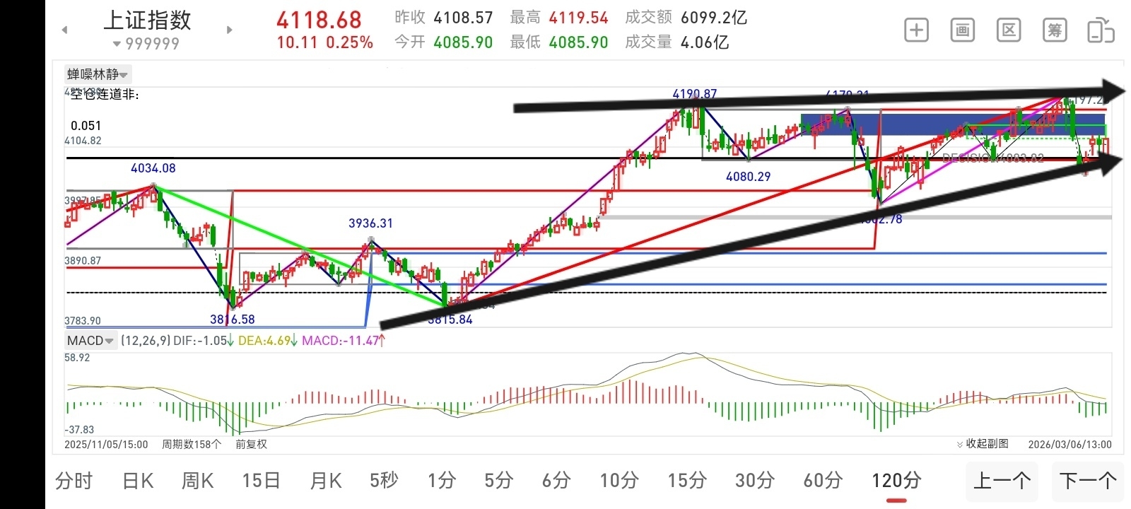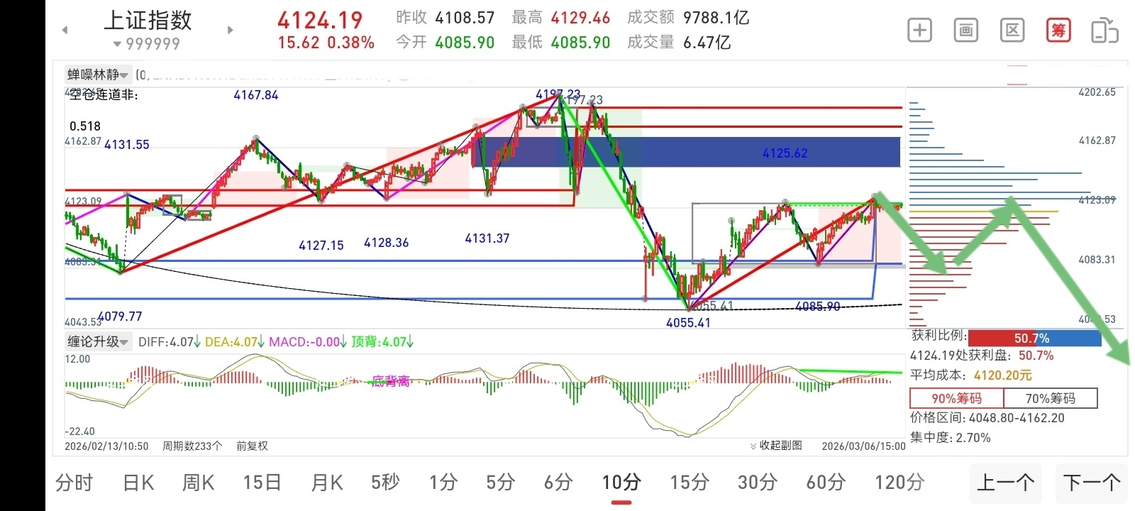MACD反复粘合,4085—4119区间是有赚钱效应的中枢。预期横跳时间不会很长。基于10分钟走势的几笔结构上背驰,然后向下击破缺口向下延伸打出底背离后再向上展开超短线的反弹。