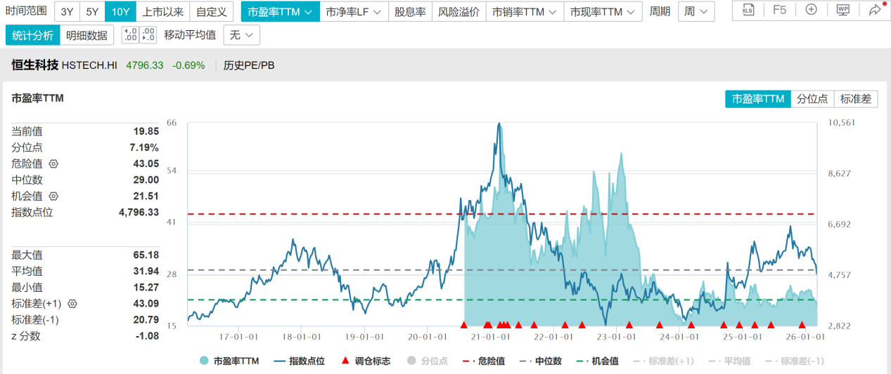 先看历史分位,截至3月5日,恒生科技指数滚动市盈率约19.85倍,处于近10年以来7.19%的分位点位置——简单说,就是比历史上90%的时间都便宜;和2021年初60多倍的高点比,回调幅度超60%,估值泡沫早就挤干净了,悲观情绪也差不多释放完了。