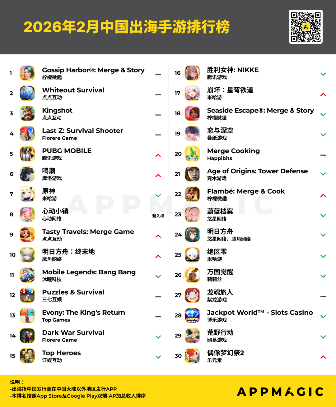 另据AppMagic统计,2月世纪华通旗下《Whiteout Survival》《Kingshot》《Tasty Travels: Merge Game》齐聚中国出海手游排行榜前十。