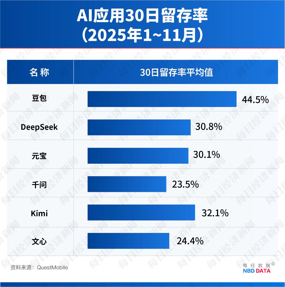 而当流量潮水退去后,用户留存的考验才真正浮出水面。截至2月23日千问应用日活回落至3245万,较峰值已腰斩过半;从更长的周期看,2025年1月至11月千问的30日留存率均值仅23.5%,在主流AI应用中垫底,用户粘性有待夯实。