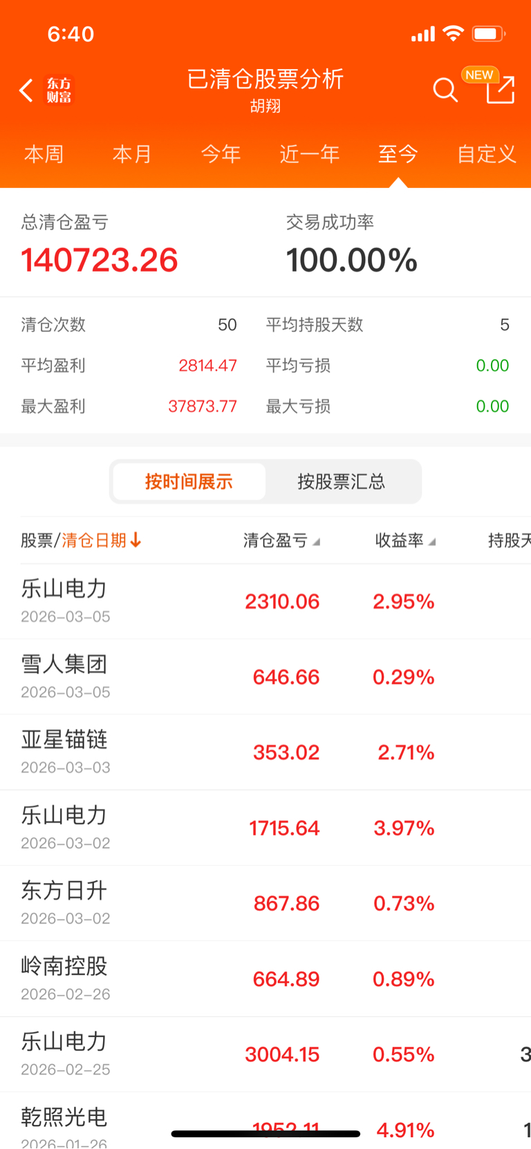 小胡2025-08-11入驻东财,选股成功率100%,清仓50次 平均持股天数5天,全部盈利出局!