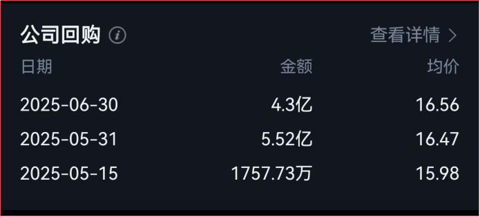 不仅如此, 2025年公司还完成了10亿元的回购。回购均价16.5元附近,这个是可以作为估值和交易的参考的。