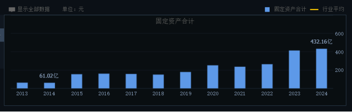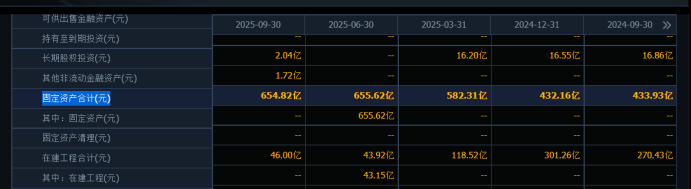 2025年前三季度,公司固定资产增长到654亿元,在建工程迅速下降到46亿元。