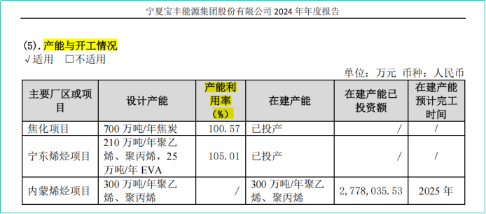 截至2024年末,公司宁东三期25 万吨/年 EVA 项目正式投产;内蒙古260万吨/年煤制烯烃及配套 40万吨/年绿氢耦合制烯烃项目建设快速稳步推进,项目第一系列 100 万吨/年烯烃生产线于 2024 年11月投入试生产,第二系列 100万吨/年烯烃生产线于 2025年 1月投入试生产,第三系列100万吨/年烯烃生产线计划于2025年3 月投入试生产。