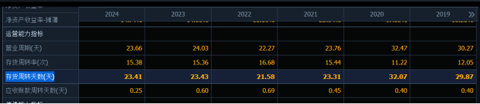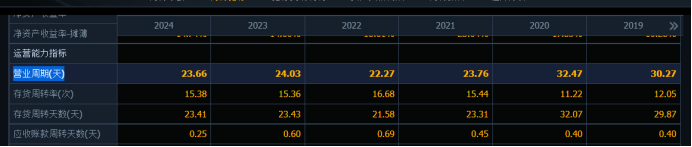 截至2024年末,公司存货周转天数23.41天,也就是说,公司的存货从投料开始到销售出去,只需要23.41天,而这个数字在2021年是32天。这个存货周转速度是非常快的,且不断提速。说明公司的运营效率是不断提高的。