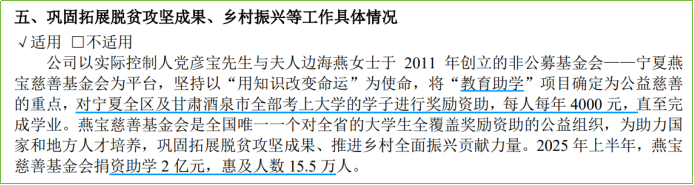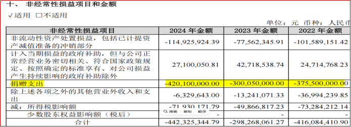 原因是宝丰能源每年都有大额捐赠支出,主要用于支持教育事业。2024年对外捐赠4.2亿元,惠及15万学生。每个大学生,每年4000元。