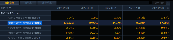 2025年前三季度,公司经营活动产生的现金流量净额已经高达135.82亿元。这真是印钞机。