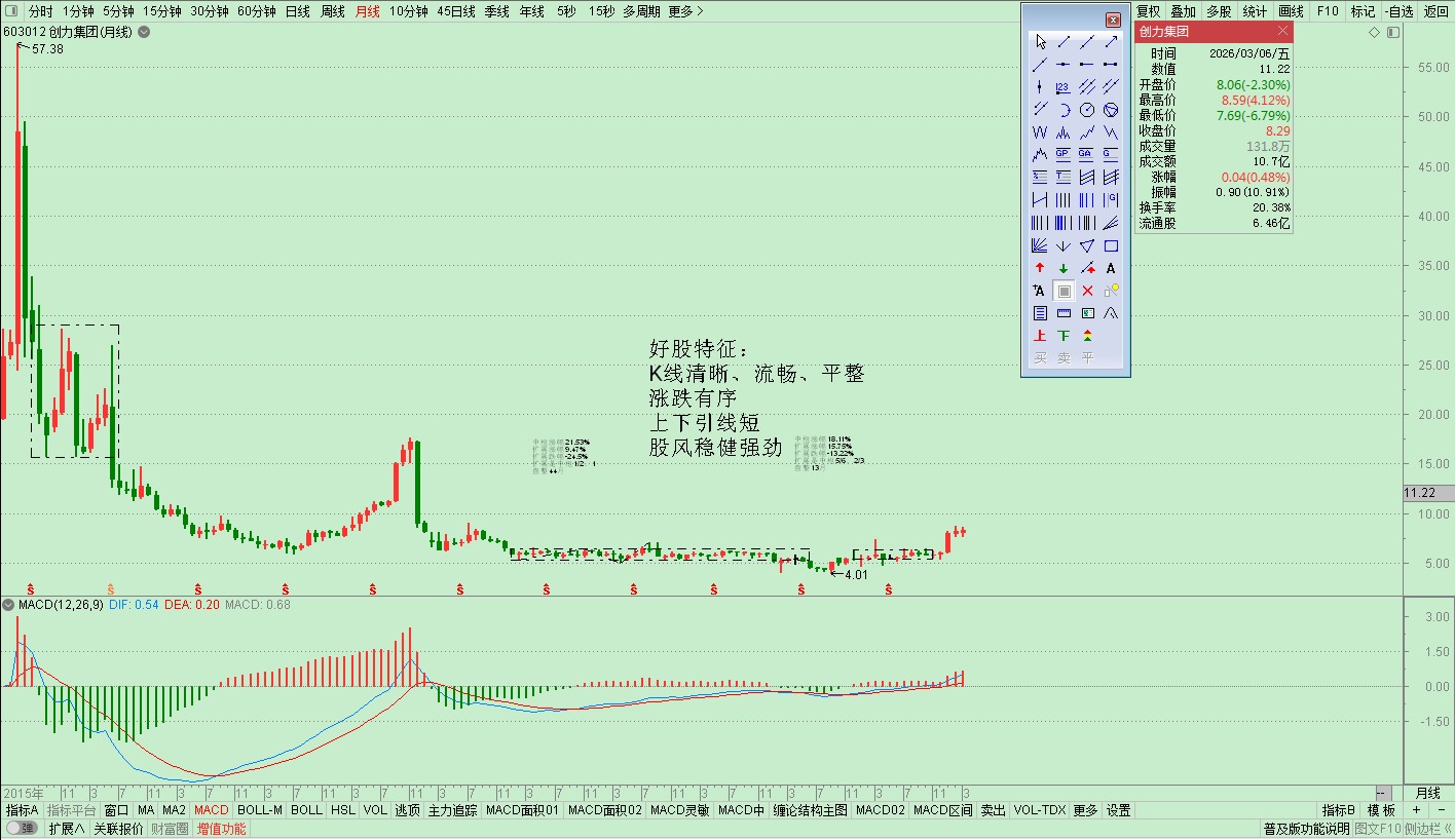 好股特征:K线清晰、流畅、平整;涨跌有序;上下引线短;股风稳健强劲。上涨、盘整、下跌,走势清晰、结构流畅、底部、突破洗盘、上涨、脉络清晰。