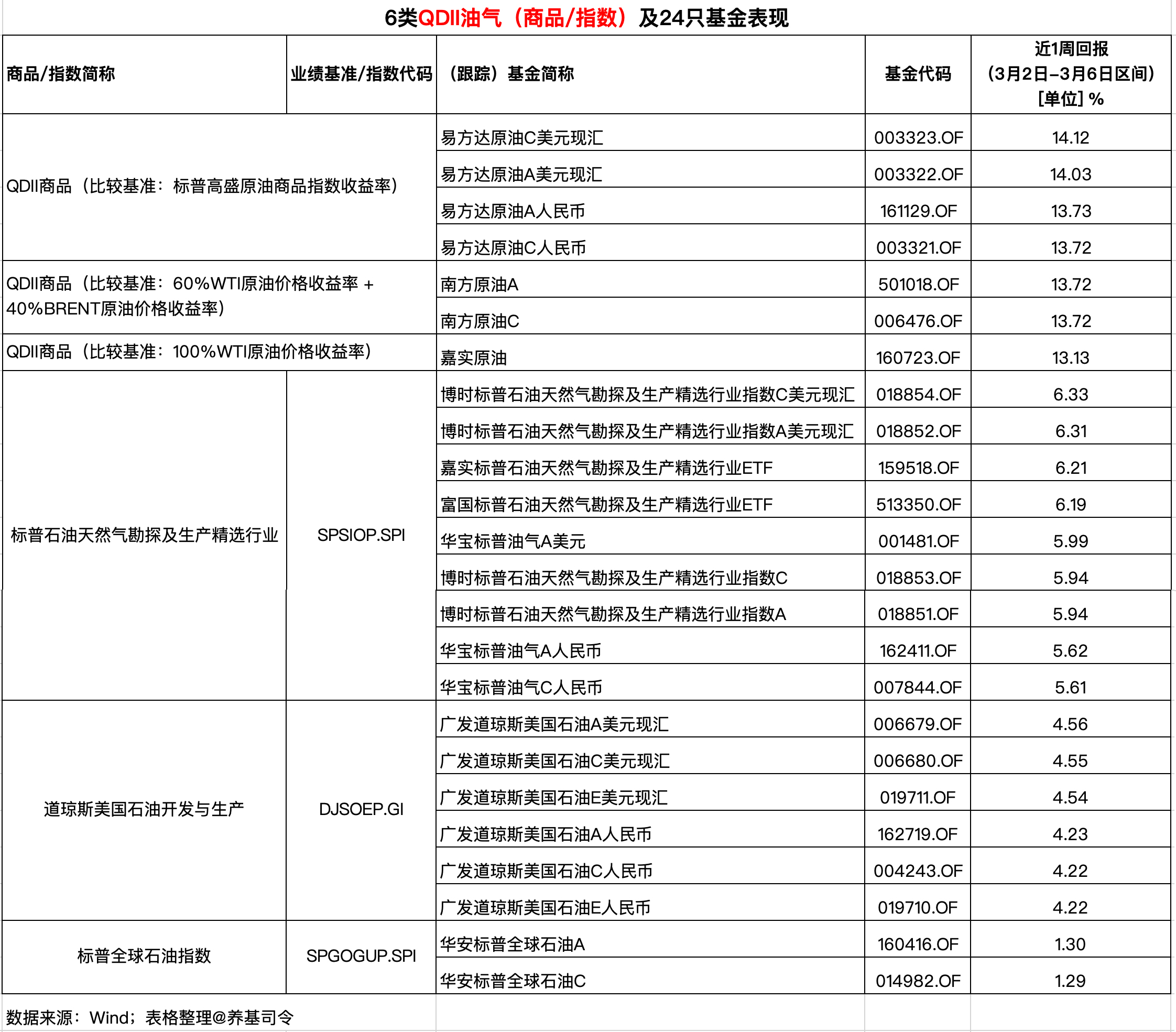 从上周表现来看,易方达原油A人民币上涨13.73%,业绩比较基准为“标普高盛原油商品指数收益率”;南方原油A上涨13.72%,业绩比较基准为“60%WTI原油价格收益率+40%BRENT原油价格收益率”;嘉实原油上涨13.13%,业绩比较基准为“100%WTI原油价格收益率”。