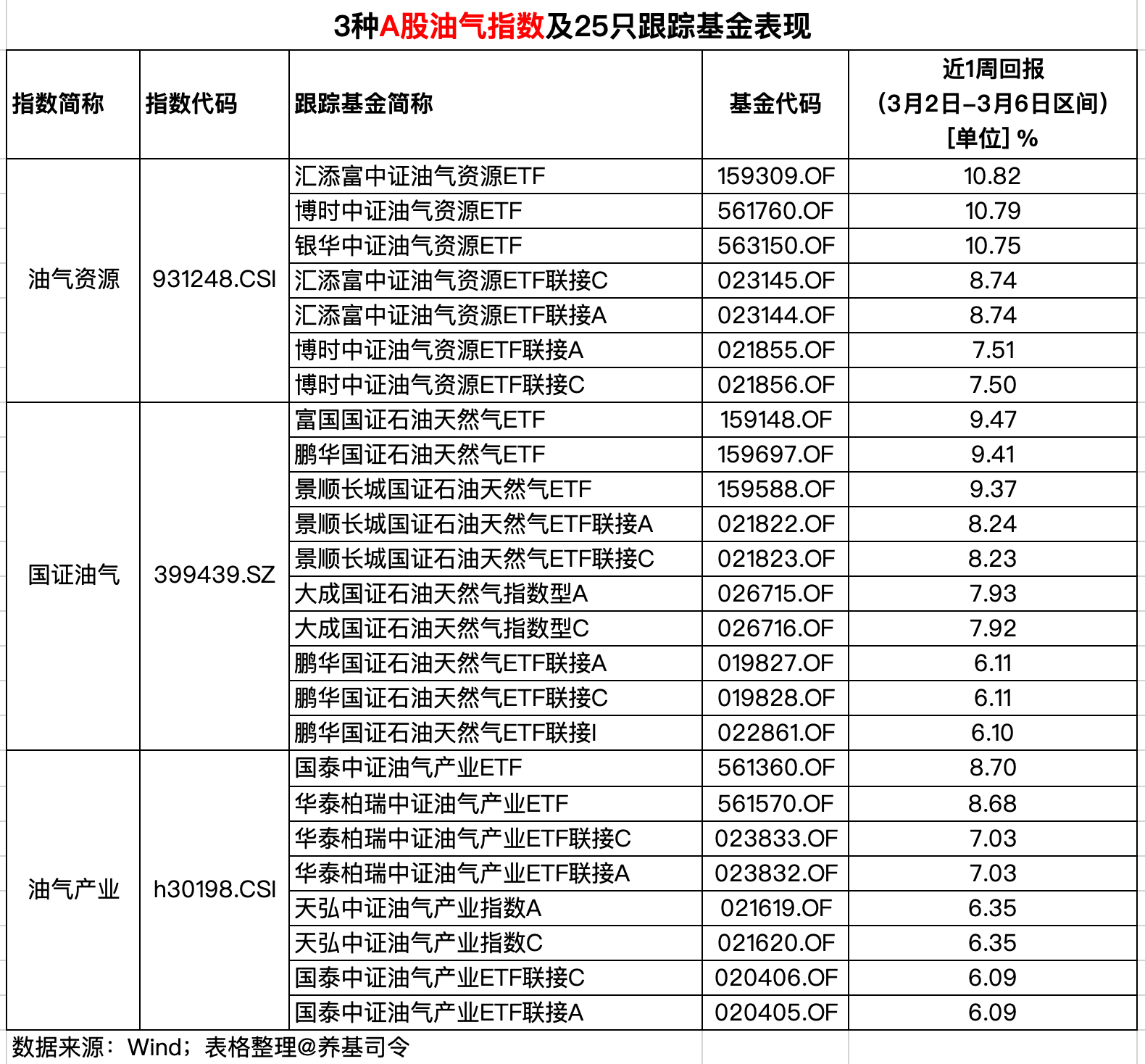 从上周(3月2日-3月6日区间)表现来看,油气资源(931248.CSI)上涨10.90%,国证油气(399439.SZ)上涨9.50%,油气产业(h30198.CSI)上涨8.74%。
