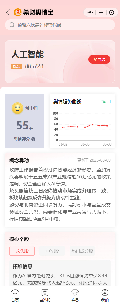 在希财舆情宝上看到了当前对人工智能概念的最新异动分析——政府工作报告首提打造智能经济新形态,叠加发改委明确十五五末AI产业规模超10万亿元的政策定调,资金全面涌入AI赛道。龙头股连续三日涨停推动市场完成分歧转一致,板块从超跌反弹升级为阶段性主线。游资与北向资金同步发力,高封板率与巨量成交验证资金共识,两会催化与产业高景气共振下,行情有望延续至3月中旬。