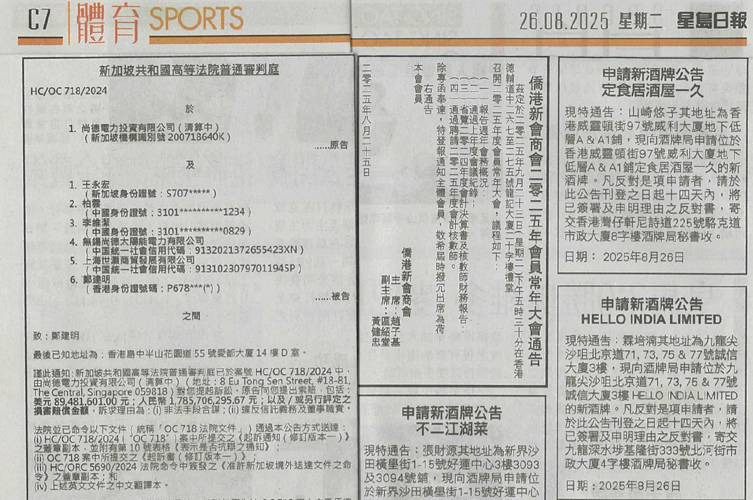1. 弘元绿能(603185)目前正在参与无锡尚德太阳能电力有限公司预重整(案号:(2025)苏0214破申37号,后已转入正式重整)。 无锡尚德涉及一起新加坡高等法院诉讼(案件编号:HC/OC718/2024),原告索赔约人民币24亿元(见星岛日报公告,2025年8月26日)。
