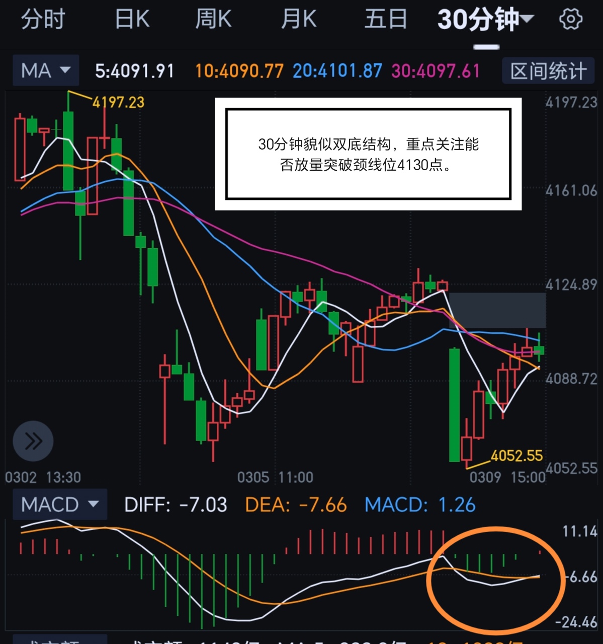 今天走势决定短线是反抽?还是真的止跌启动春季行情?如果放量拉升大涨突破4150点就坚决看多做多,假如缩量反抽挑战一下4130点回落冲高还是要降低仓位,热点方向重点关注龙虾概念、算电协同、特高压、智能电网、东数西算方向。本月还有一只靴子需要等待落地,就是美联储议息会议公布结果。接下来走势从纯技术上分析,日线、周线指标顶背离态势与分时30分钟指标底背离得矛盾如何解决?这就需要看今天反弹力度决定短线走势,30分钟图上貌似双底结构,重点关注今天能否放量突破4130点?不能放量超过两万五千亿指数涨上去还要下来,我思想上还是做好准备展开周线级别调整,调整目标位第一支撑4002点,第二支撑位就是3807点。国内消息面主要是“养龙虾”彻底火了!腾讯总部门前大排长龙等着免费安装“龙虾”,闲鱼上代装“龙虾”服务几十到上百不等,各大云厂商纷纷推出一键部署教程和服务。而这里的“龙虾”可不是指我们吃的小龙虾,而是指“OpenClaw”,“claw”有爪和工具之意,正契合了它的工具属性,并且OpenClaw的吉祥物就是一只可爱的龙虾。国家发改委发布消息称,自24时起,国内汽油价格和柴油价格分别上调695元/吨、670元/吨。折合升价,92号汽油、95号汽油和0号柴油分别上调0.55元、0.58元、0.57元。至于热点方向养“龙虾”引来黑手安全警报拉响了,因此云计算+网络安全题材可以适当低吸。无锡高新区发布“养龙虾”12条最高补贴500万,再次强调短线调整是由于外部突发性特大利空袭击后进一步恶化造成的,因此我国股市是被动下跌的。