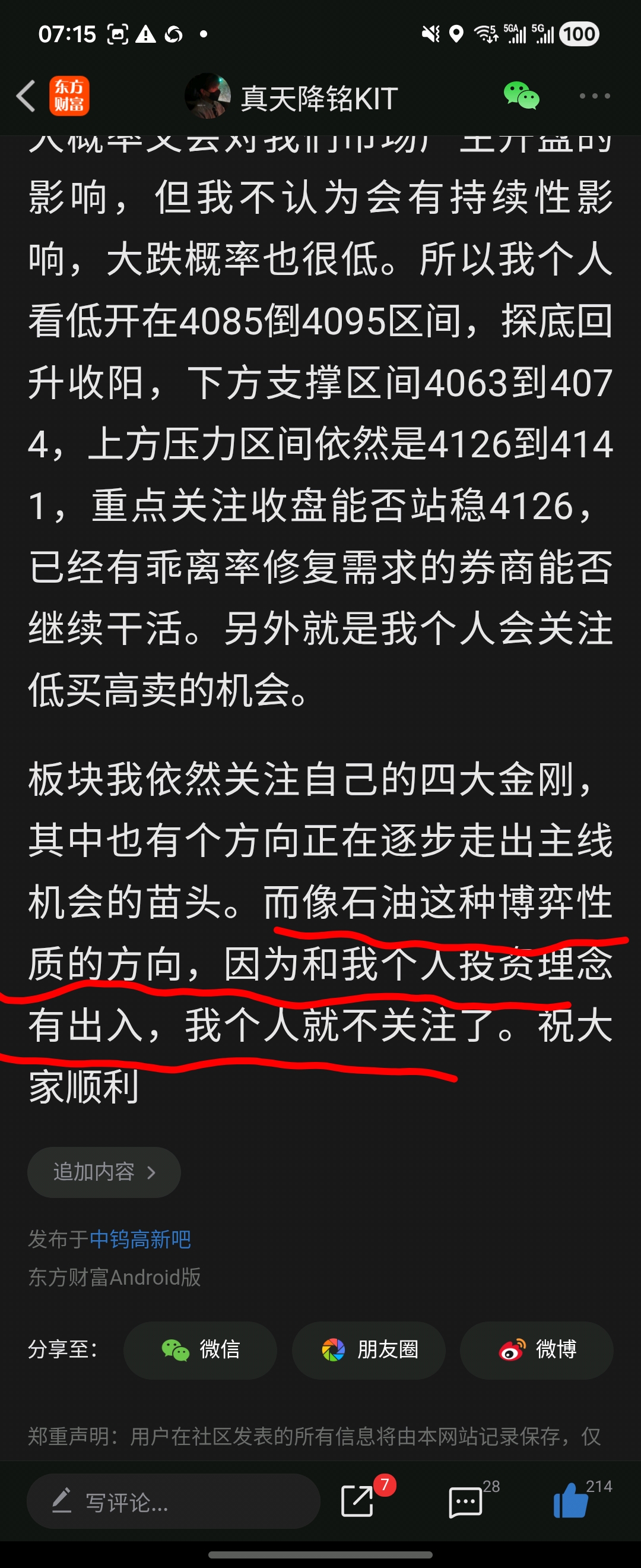 板块方面个人毫无疑问依然关注个人看好的四个方向,潜在的主线机会可能会慢慢浮出水面了。石油这种回落本也就是大概率的事,周末特意和铁粉们分享了个人观点,石油要看的是持续性而不是某一两天的情绪炒作。