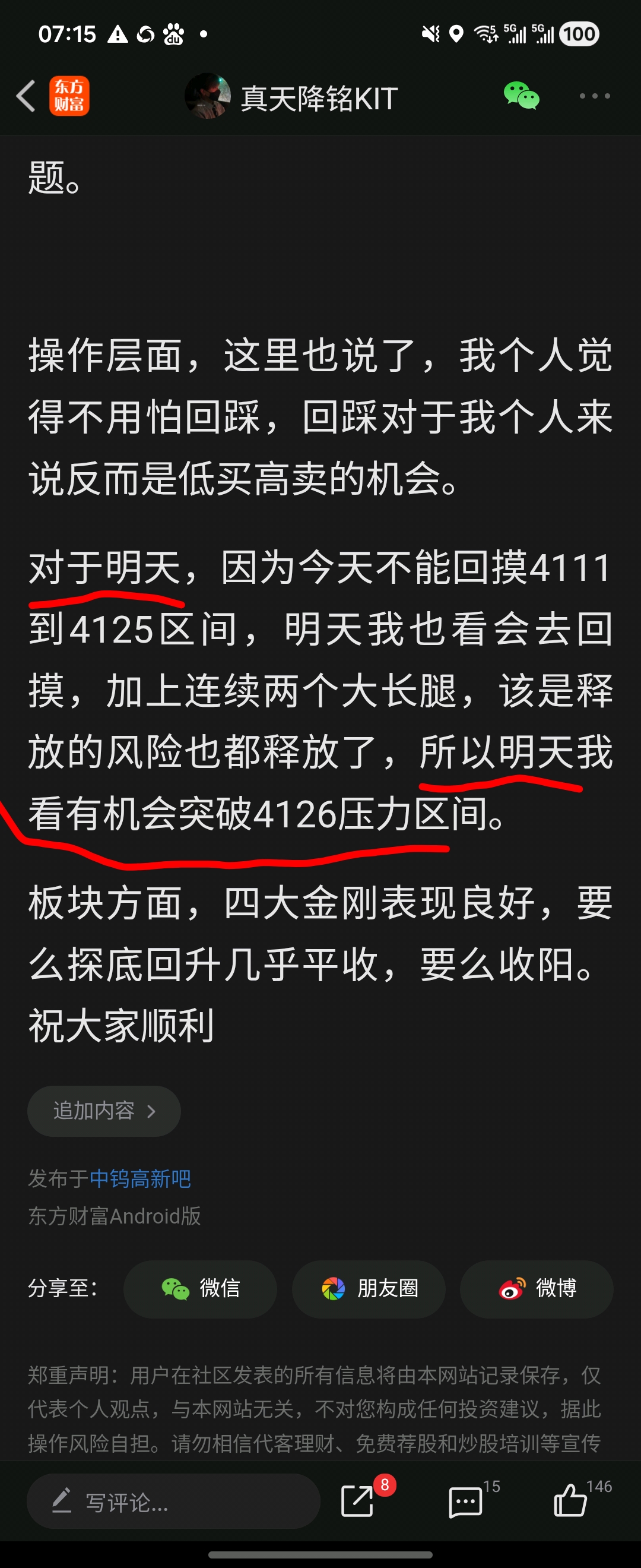 综上,今天相对清晰了,我个人认知结合技术推演,今天高开4116到4125,高开高走收阳,尝试再次突破4126到4141压力区间,并有可能去摸4150。下方支撑直接抬高到4106到4111,上方压力区间还是4126到4141。