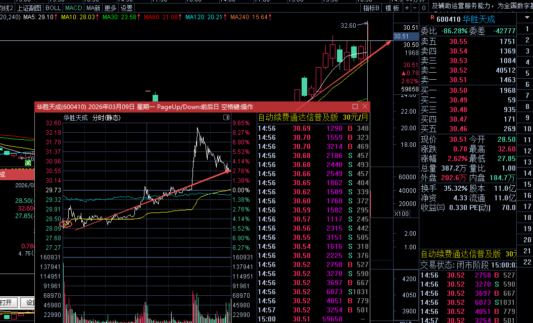 600410 华胜天成:在昨天的早评当中,我们明确的提到了上涨趋势没有结束。属于上涨的中继,并且上周五的尾盘,有40多亿的资金在尾盘半小时内跑步进场。这就是昨日早评我们提示波段低吸进场的理由。昨日下午虽然先是放量上涨,随后震荡回落,但是从日k来看,这是一个洗盘的动作。上涨趋势不变,盘中灵活对待。