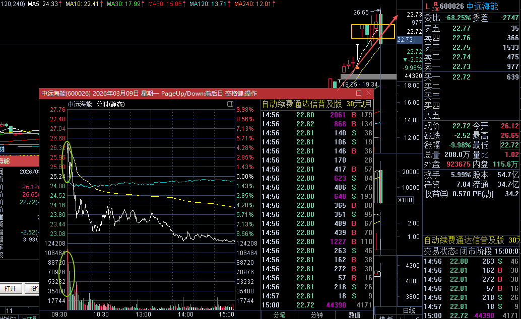 中远海能 600026:这个股票昨日先高开,随后放量下行。但是从分时图来看,放量下行以后,波段高点是向下移动。从成交量来看,是一个放量下跌,缩量反弹。说明在开盘时有大量的资金作为短线出逃。那么作为短线的投资者,此时可以先进行波段卖出。卖出后,再择机进行波段低吸。或者是干脆获利离场。从近几个交易日K线图来看,整体仍然是一个横向震荡的节奏。但是上涨趋势并没有完全形成破坏。注意10日均线的技术面的支撑。短期内要注意盘中出现的技术面止跌的信号。同时也要注意突然出现的反包上涨的阳线的信号。昨日并没有大量的卖单封跌停。说明他的抛压并不是持续性的较大的行为。今天要注意10日均线支撑位的情况。同时也要注意放量调整后的缩量止跌的信号。同时也要防止反包的长阳出现。根据不同的信号去做不同的操作。
