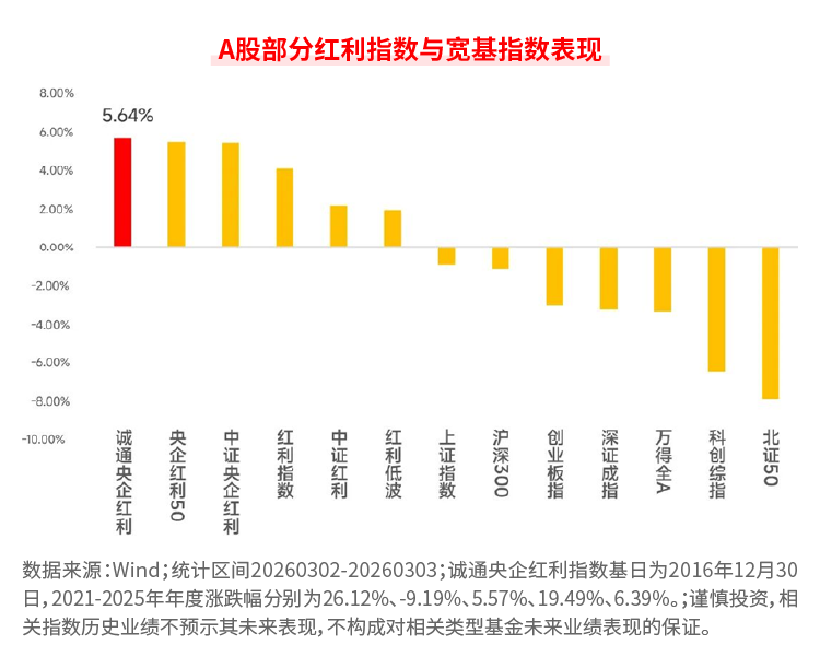 Wind数据显示,诚通央企红利指数在两个交易日里上涨5.64%,不仅在一众红利指数中表现居前,更大幅跑赢同期A股主要宽基指数。