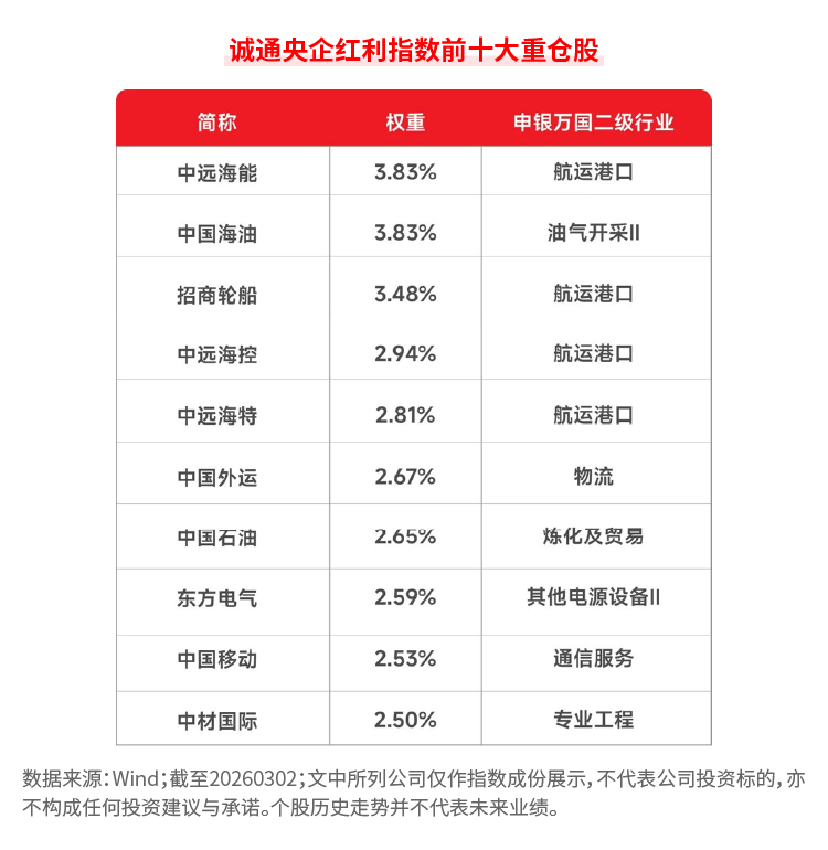 首先,诚通央企红利指数油气股、航运股含量高,特别是前十大重仓股中云集了一批“巨轮”和“油头”,这些股票有望受益于当前地缘政治,从而带动指数走强。