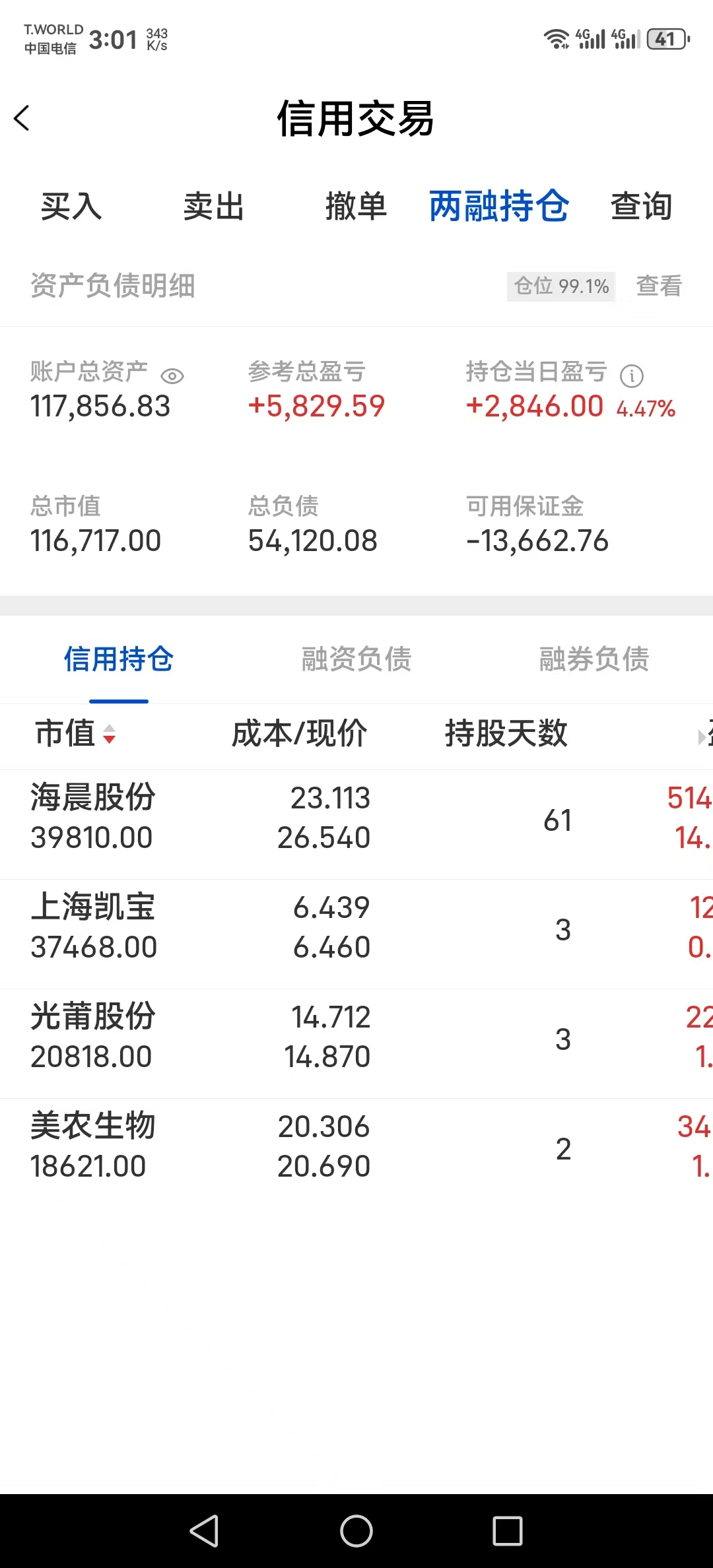 今日账户总资产117,856.83 元,总负债54,120.08 元,净资产约63,736.75 元,杠杆倍数约1.85 倍,仓位99.1%,保证金仍为负值(-13,662.76 元),处于高杠杆满仓状态。当日大幅盈利2,846 元,涨幅4.47%,参考总盈利回落至5,829.59 元,账户整体实现回血,核心标的领涨带动收益修复。