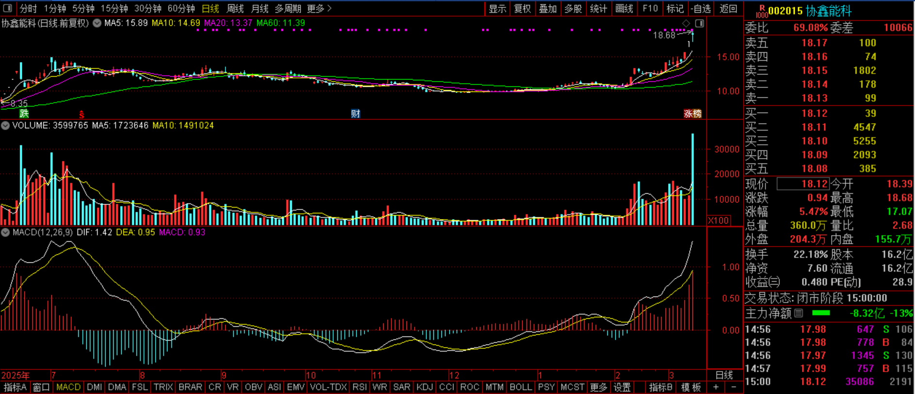 $协鑫能科(SZ002015)$协鑫能科:算电协同+虚拟电厂+分布式光伏。今日该股放历史巨量探底冲高,虽从高点有所回落,不过幅度不大,短期上涨已经较大,因此笔者以为这种走势短期而言会有超调,不过即便超调仍偏机遇,因此不能轻易放弃,如果明日强势分歧,甚至地板的话,可能是良。这个具体明早细说。就走势而言,今日依旧是良性上涨或者说猪力的试探性突破。
