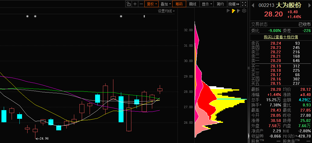 早上开盘拉升到28.25附近位置拐头震荡下行到27.94附近止跌回弹后震荡上行至28.43遇阻回落,震荡下探到27.85企稳,随后全天在27.85-28.3区间反复震荡,多数时间围绕黄色均价线上下小幅波动,尾盘微微收翘,是典型冲高回落、窄幅震荡、围绕均价整理的走势。早盘量能稍大释放了部分抛压,之后量能持续萎缩,市场观望情绪浓厚,多空双方都比较谨慎,27.85附近支撑有效,28.43上方抛压仍存,短期震荡格局未改。今天走势也符合我盘前的预期,我早上见它冲高遇阻也是减了仓,下午看见28附近位置紫金承接得不错我也是接了回来。
