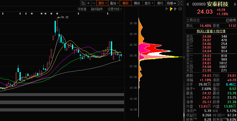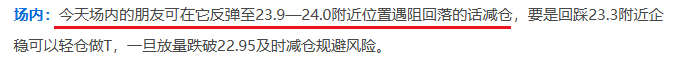今日早上高开后震荡下行到23.70附近位置止跌,随后弱势横盘震荡,午后逐步修复但力度有限,全天呈现冲高回落、缩量整理走势。早盘抛压有所释放,午间观望情绪浓厚,尾盘虽有小幅回升但量能不足,23.70附近位置支撑明显,24.32上方仍然存在一定压力,短期震荡格局未改,操作上还是要保持谨慎。我今天也是在它冲高遇阻后及时落袋了部分仓位。
