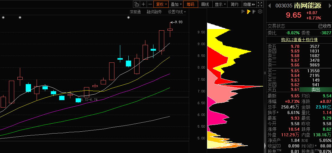 今天开盘后拉到9.93附近位置拐头走震荡下行到9.29位置,随后在9.3-9.6附近弱势横盘,尾盘逐步收翘回升,全天呈现探底横盘、尾盘修复的缩量整理走势。早盘抛压集中释放,午间观望情绪浓厚,尾盘虽有翘尾但量能不足,9.3附近位置支撑明显,9.9上方仍然存在一定压力,短期震荡格局未改,操作上还是要保持谨慎。今天走势入盘前预测一样,我看见它9.3附近承接不错也是低吸进场了,继续看好它明天走势。