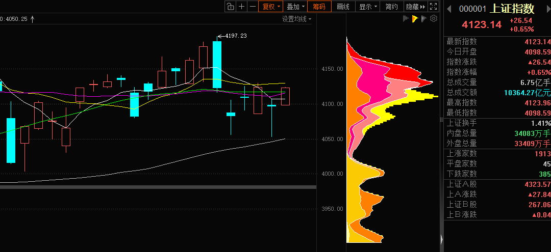 A股市场未延续前日普跌格局,迎来强势向上修复。三大指数早盘普遍高开,午后涨幅持续扩大,上证指数重新站上4100点整数关口,收报4123.14点,上涨0.65%;创业板指全天高歌猛进,收盘大涨3.04%,报3306.14点,几乎反包昨日阴线实体,深成指亦上涨2.04%,凸显中小盘个股活跃态势。量能方面,两市成交额虽较前一日巨量有所收敛,但仍维持在2.4万亿左右的活跃水平,市场交投情绪良好。