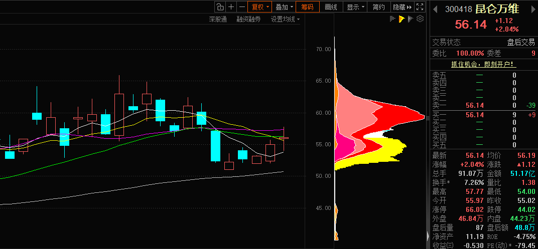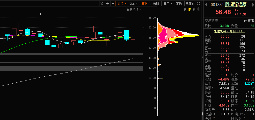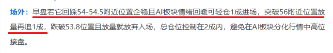 今天平开54.10后拉升到57附近位置拐头向下触及55.68左右止跌回弹走分时上行到58.00遇阻震荡回落至56.5附近后,午后全程在55.9-56.63附近弱势横盘,且始终运行在黄色均价线下方,尾盘收在56.48,全天呈现平开冲高、冲高回落、午后弱于均价的走势。早盘放量拉升后抛压逐步显现,午后量能萎缩、观望情绪加重,买盘承接不足,56.0附近支撑勉强有效,58.00上方压力明显,短期情绪从亢奋转向谨慎。我早上也是在57.51附近位置减了半仓,下午在56.22附近也是接了回来。