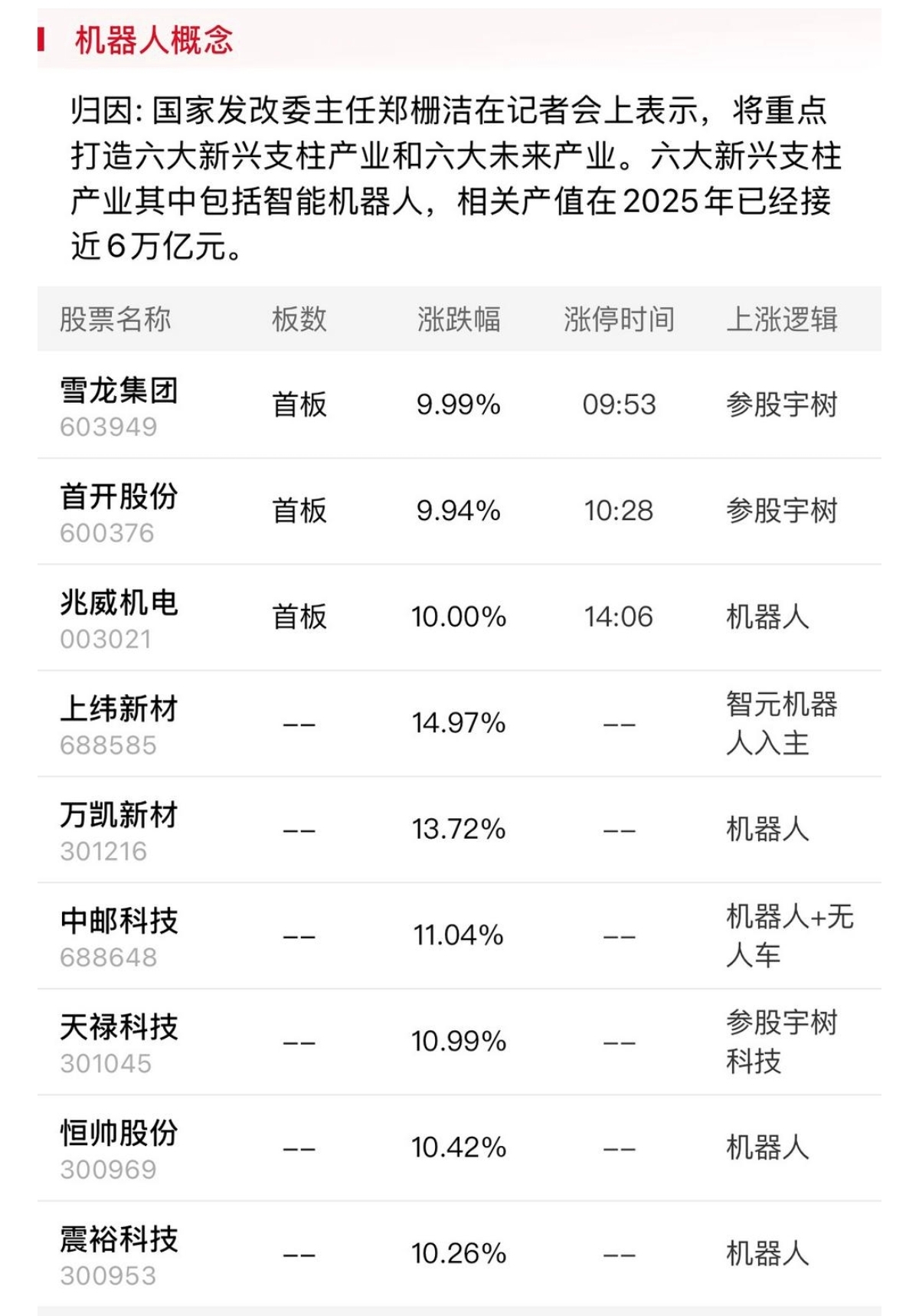 本月以来,多家机构研报称,$特斯拉(NASDAQ|TSLA)$ 预计在2026年Q1展示OptimusV3版本原型机,并启动量产,打算在2026年底建立年产100万台人形机器人生产线,中期提升至1000万台级别。机器人产业链沉寂多时后展开久违涨势,叠加并购重组和股权转让方向的人气股嘉美包装、上纬新材、锋龙股份展开大幅反弹,昨日登陆港股市场的$兆威机电(SZ003021)$ 在港股飙升超26%带动下,午后强势封涨停,特斯拉链相关核心标的浙江荣泰、五洲新春、长盛轴承等也展开不俗反弹。相较于算力、半导体等成长赛道,机器人产业链的人气仍高度取决于特斯拉链为主的出海线以及宇树等拟上市或叠加股权转让概念的国内线的几家龙头品种,若短期缺乏消息面的催化,类似今日的单日大幅反弹或难有持续性。