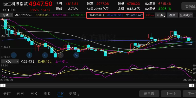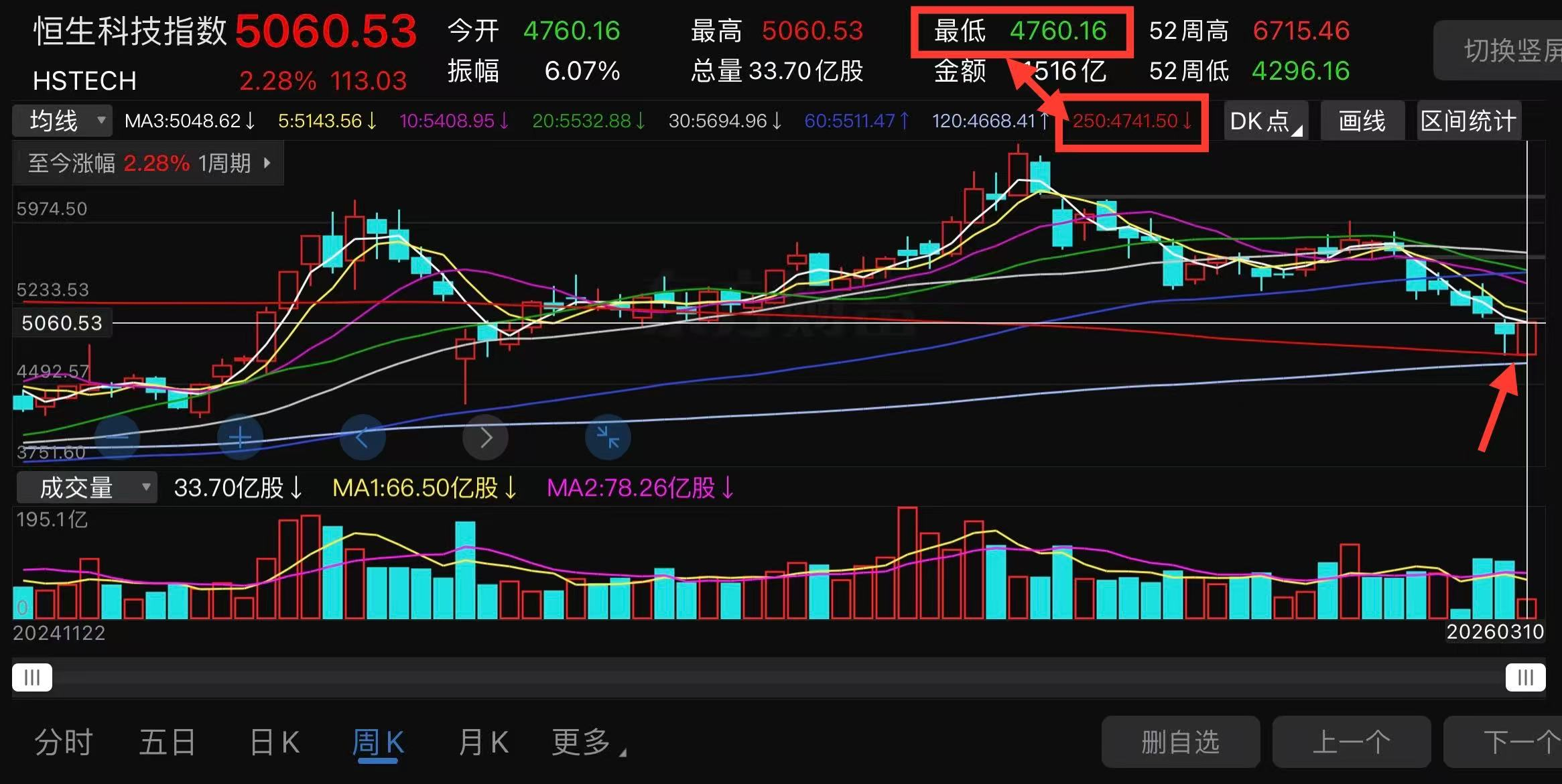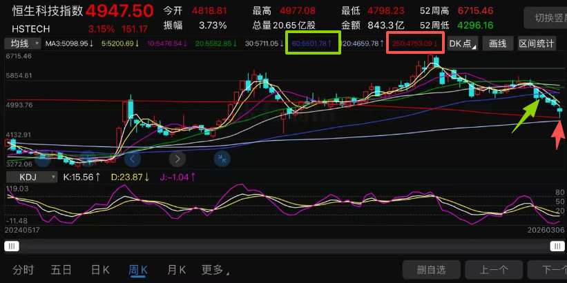 最关键的大家可以看到250周线数值是4753,如图红色方框内的数值。刚好就是最近恒生科技指数的低点附近。